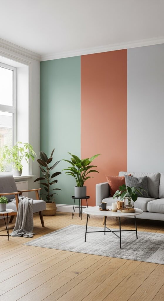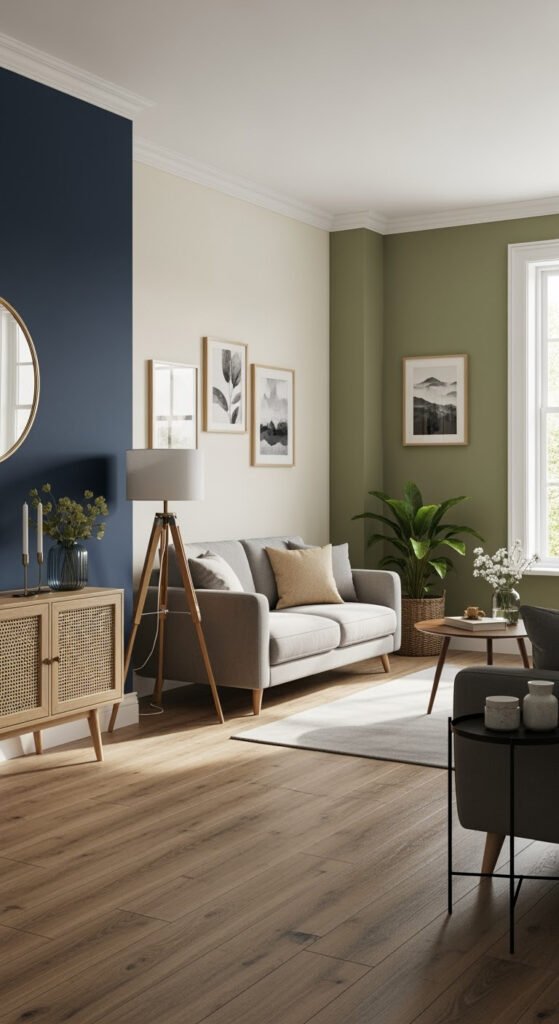 Modern interior living room featuring a stylish three-tone wall paint design. Deep navy blue, soft cream, and muted olive green walls create a bold yet harmonious contrast