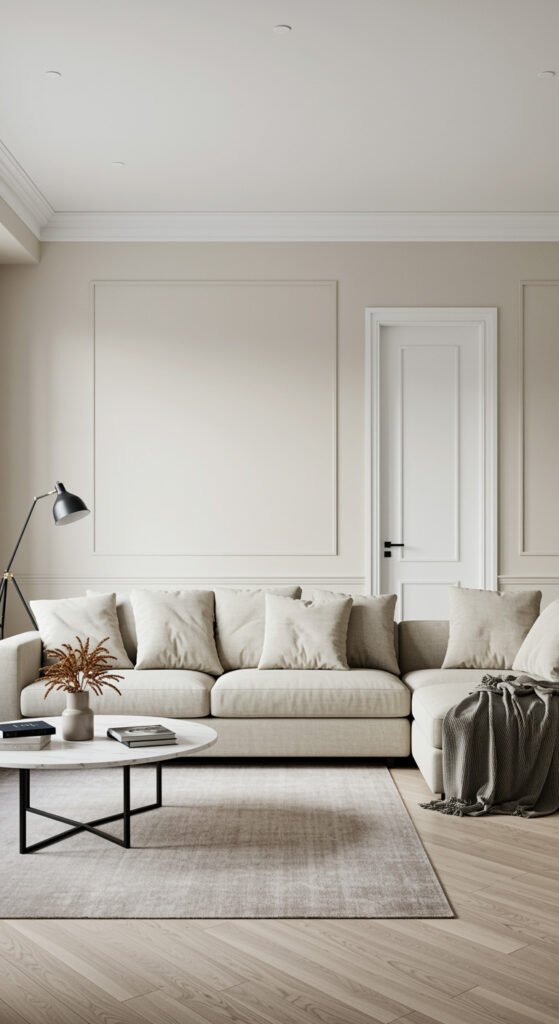 This beautifully designed living room features a fresh coat of soft beige paint, creating a calm and welcoming atmosphere